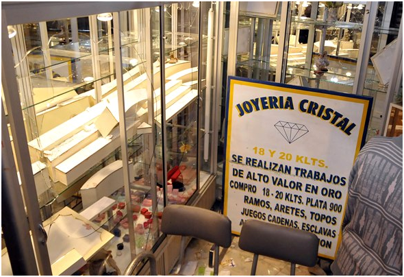 La policía desplegó operativos en todos los barrios para dar con los autores del asalto a la Joyería Cristal (foto izq) y la joyeria atracada en La Paz (der)