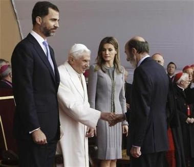 Benedicto XVI, en el que es su segundo viaje a España desde su elección en 2006, fue recibido en el aeropuerto compostelano de Lavacolla por los príncipes de Asturias, don Felipe y doña Letizia, entre una espesa niebla.