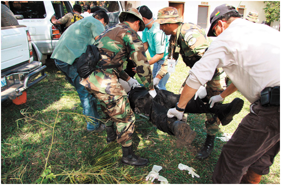 En el oriente Efectivos antinarcóticos auxilian a un herido en la balacera que hubo cerca de San Ramón, Santa Cruz, donde dos cárteles de droga se habrían enfrentado. | Fuente: Foto: Archivo