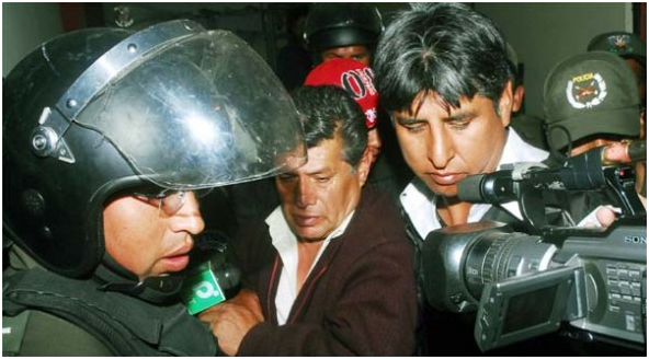 Detenido. Edmundo Larrea Holguín (centro) era escoltado por policías, en el Juzgado de Vinto, el mes de agosto de 2009. (Foto archivo Los Tiempos)