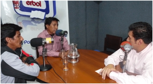 Dirigentes Alfonso Mamani y Carlos Cibairo en el estudio de emisión de Erbol- La Paz.