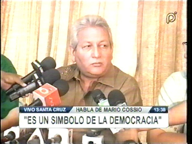 ‘Hemos decidido en Tarija poner punto final a un esfuerzo permanente de desestabilización, de derrocamiento en el que desde algunas semanas estaban muy esmerados los dirigentes del MAS y del partido de gobierno incluidos algunos Ministros de estado que ya desde hace 4 semanas estuvieron aquí planificando detalle a detalle como derrocar al Gobernador del departamento de Tarija. La Asamblea se ha reunido hoy en la mañana, y tenía como tarea proceder a la suspensión inconstitucional del Gobernador. Por eso, nosotros hemos tomado una decisión consciente de decirle no, al golpe de Estado, de decirle no a esta arbitrariedad que quiere negar la voluntad de un pueblo entero que tomó una opción electoral. Estamos aquí para defender a Tarija y para defender su proyecto histórico de autonomía. Hace 4 años, yo salía desde este mismo salón de una huelga de hambre para dirigirme al cabildo del 15 de diciembre del 2006 donde el pueblo tarijeño decidió conquistar la autonomía, la logramos y después de 4 años coincidentemente un 15 de diciembre debo ingresar otra vez a la lucha para evitar que el Primer Gobierno autónomo de Bolivia y de Tarija sea derrocado, un afán golpista que además ha estado intentando utilizar argumentaciones de carácter judicial que nada tienen que ver con la realidad y que lo único que hacen es develar que el Plan que tiene el gobierno nacional es utilizar la justicia para la persecución de los opositores y para el derrocamiento de los gobiernos subnacionales‘ manifiesta Mario Cossio. (Unitel)