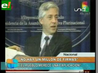 “No dejaron 800 mil firmas, solo dejaron estos cuadernos que están acá. 32 mil firmas solo recibió la Vicepresidencia. El millón de firmas no han llegado. No hay el texto que uno está apoyando. Me preocupa que existan firmas sin texto alguno. Lo que hicieron es política. Lo que dijeron no era cierto. Alguien tiene que dar la cara. Respondan al pueblo Boliviano. ”, dijo García Linera en conferencia de prensa.