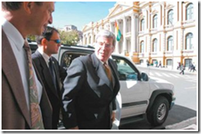 El entonces embajador de EEUU David Greenlee ingresa al Palacio de Gobierno para visitar a Rodríguez Veltzé, el 20 de junio del 2005.
