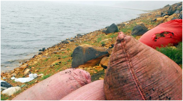 Bolsas de coca desechada por los narcotraficantes, ayer a orillas de la laguna Corani. Los Tiempos