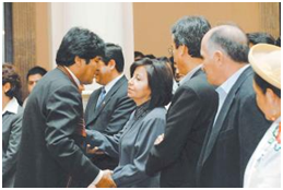 El presidente Evo Morales saluda a la nueva ministra de Desarrollo Productivo, el domingo. Foto: David Guzmán