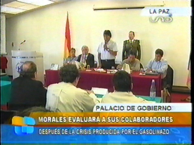 ‘El es un Mandatario, es un primer ciudadano. ¿Quienes trabajan? Los técnicos, los técnicos se llaman ministros. Los ministros de área económica, de hidrocarburos, Sacha Llorenti que ha expresado hasta el momento quien controla las fronteras y toda la cadena de Ministros. Esas cadenas primero por vergüenza debían de irse, porque le han hecho meter la pata al hermano Evo Morales y el pueblo. Nosotros transmitimos, hemos bajado a los suyos y marcas el sentimiento que dice, cambio de ministros. Porque si no escucha nuevamente al pueblo otra vez le van hacer meter la pata. Yo creo que tienen que cumplir con el cambio de Ministros’ manifiesta Rafael Quispe. (Unitel)
