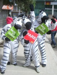 De verdad me causó mucha gracia al retornar a la ciudad, me causó gracia, de verdad, unos grafitis contra las cebritas, porque se hablaba de cebritas en minúsculas porque son el símbolo más tierno de nuestra ciudad. Acusadas de haber organizado la resistencia a Evo Morales y el gasolinazo. Como broma está bien pero si es una acusación y escuché a algún jefe policial acusar a las cebritas de haber organizado la resistencia contra el gasolinazo, me parece que se convierte en una broma de mal gusto. Perseguir a las cebritas me parece lo último, porque uno sabe quien está detrás debajo del disfraz de la cebrita, cómo saber que la persona que usa el disfraz y trabaja como cebrita estuvo o no en las marchas contra el gasolinazo, marchas que además tenían razón de ser.