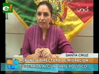 La directora departamental de Migración de Santa Cruz, Maria Paula Ferrufino Rodríguez, presentó su renuncia al cargo argumentando problemas de tipo personal. Ferrufino se desempeñó como directora de Migración desde el 19 de septiembre de 2009. Al ser consultada si su renuncia obedece a presiones políticas, descartó esa situación y aseguró estar agradecida, especialmente con la directora nacional de Migración, María René Quiroga, por la confianza que se le brindó para conducir la institución.