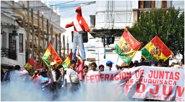 Sucre |Correo del Sur.- Una bulliciosa marcha encabezada por la Federación de Juntas Vecinales, la Central Sindical de Trabajadores Originarios y por los tres concejales del Movimiento Al Socialismo (MAS) opositores a la restituida alcaldesa de Sucre Verónica Berrios llegó ayer a la plaza 25 de Mayo para exigir la renuncia del viceministro de coordinación gubernamental, Wilfredo Chávez, y la alcaldesa interina.