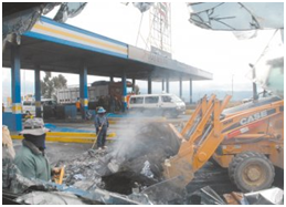 image Limpieza. Obreros retiran los restos de las casetas de la autopista, destruidas en la marcha del jueves.