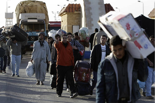 Trabajadores egipcios en Libia regresan a su país por la frontera terrestre de Salloum (este).- AP