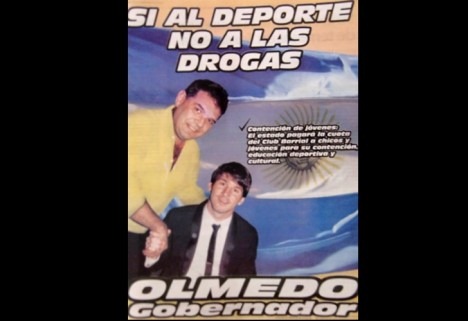 La semana pasada, Olmedo, quien presentara un proyecto para la vuelta del servicio militar obligatorio, publicó en el diario “El Tribuno” de Salta un aviso de campaña con la foto en que se lo ve dándole la mano al astro rosarino y la leyenda: “Si al deporte no a las drogas. Contención de jóvenes: El estado pagará la cuota del club barrial a los chicos y jóvenes para su contención, educación deportiva y cultural”. El viernes, la misma publicidad apareció en forma de afiches con los que el diputado mandó a empapelar las calles salteñas.