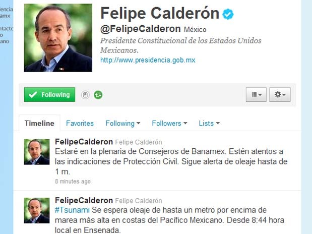 A través de su cuenta en Twitter, el presidente Felipe Calderón se ha encargado de mantener informada a la población mexicana sobre el impacto de tsunami en costas mexicanas del Pacífico así como expresar sus condolencias por los decesos en el país asiático.