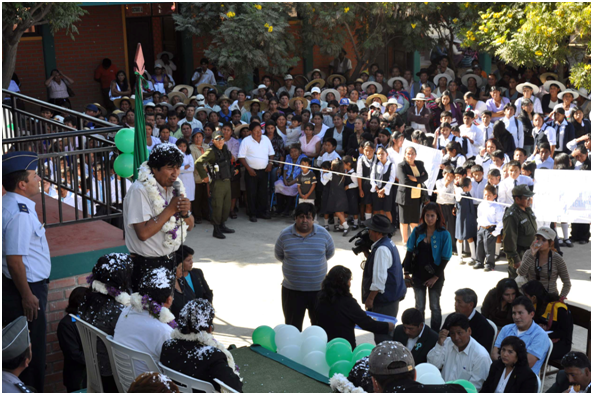 El Presidente Evo Morales en la entrega ayer sábado de un establecimiento educativo en el municipio de Punata.(G. Jallasi, ABI)