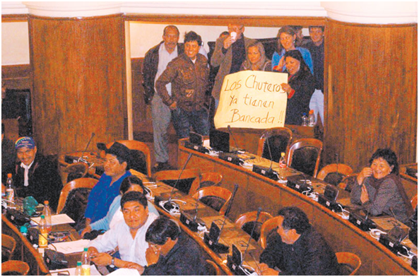 La diputada de Unidad Nacional (UN) Elizabeth Reyes levantó un cartel que decía “Los chuteros ya tienen bancada”, hecho que fue objeto de burla por el titular de Diputados, que aseguró que con esa pancarta los opositores demostrarían que ellos son la bancada de los chuteros.