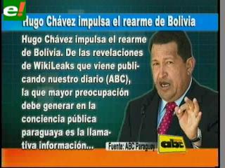 Hugo Chávez impulsa el rearme de Bolivia. De las revelaciones de WikiLeaks que viene publicando nuestro diario, la que mayor preocupación debe generar en la conciencia pública paraguaya es la llamativa información proporcionada por un alto militar boliviano el 22 de setiembre del 2008, sobre la abierta y desembozada intromisión del Gobierno venezolano en los asuntos internos de Bolivia, según dos líneas de acción concomitantes: la repotenciación de sus Fuerzas Armadas y la organización de milicias populares mediante adoctrinamiento ideológico y entrenamiento militar. Contrariamente a lo que afirma el presidente Lugo, Evo Morales es un potencial enemigo del Paraguay.