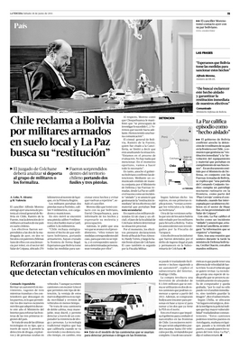 El gobierno de Bolivia confirmó anoche la detención de 14 militares de su país en la frontera con Chile, y comunicó que gestiona su "restitución inmediata" y la "devolución del equipamiento y material que portaban en cumplimiento de sus funciones". En un documento emitido por el Ministerio de Defensa, en conjunto con las Fuerzas Armadas de Bolivia, se explica que "una patrulla del Comando Conjunto Andino cumplía un patrullaje nocturno rutinario en la frontera, como parte del ‘Plan Cerrojo’ contra el contrabando, cuando fue interceptada por carabineros chilenos en el sector de Huay llas, en las proximidades del Salar de Coipasa".