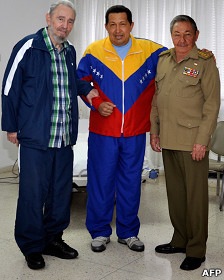 Al estilo del convaleciente Fidel Castro, del cual cada ciertos meses se divulgaban imágenes, el presidente venezolano apareció –vestido de equipo deportivo con los colores de la bandera venezolana– rodeado por el ex presidente de Cuba y el actual mandatario, Raúl Castro.