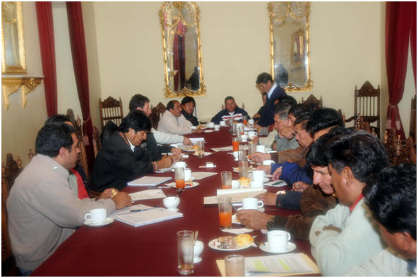 En la ciudad de La Paz a los 19 días del mes de junio del 2011, se reunieron en Palacio de Gobierno, por una parte el señor presidente del Estado Plurinacional, Evo Morales, los ministros de la Presidencia, Carlos Romero, de Obras Públicas, Walter Delgadillo y el viceministro de Coordinación con los Movimientos Sociales, César Navarro.