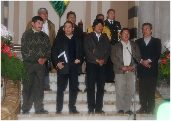 imageEl Presidente Evo Morales y ministros de la Presidencia, Carlos Romero, y de Obras Públicas, Walter delgadillo, junto a dirigentes del autotransporte Libre informan la noche del sábado sobre la derogación de tres artículos del Decreto 890. Foto ABI.