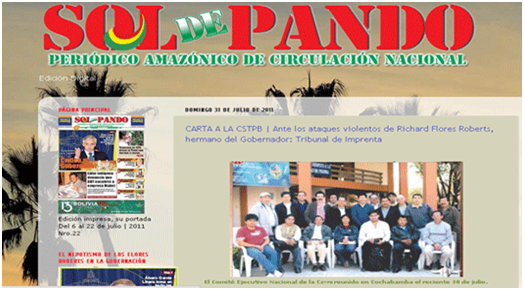 El Director del periódico Sol de Pando sospecha que el objetivo de esa “campaña” mediática es dejarle sin colaboradores en Cobija y está seguro que el mismo Richard Flores es el autor de una serie de llamadas anónimas que estaría recibiendo la gerente del periódico, Silvia Antelo, a quien presuntamente la advirtieron que ‘cuando vayan a Cobija no saldrán vivos’.
