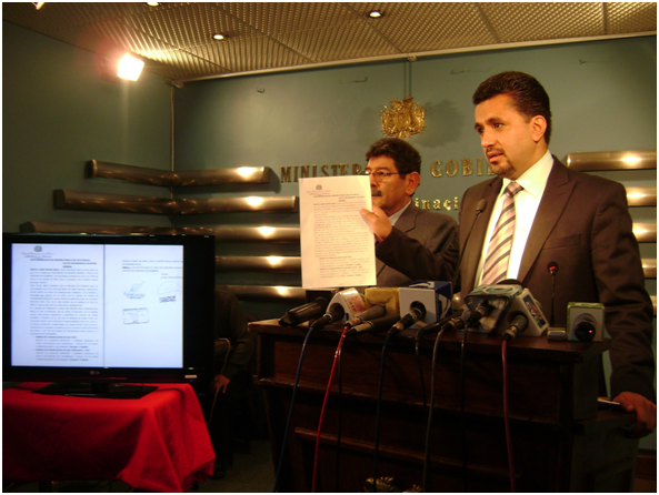 "Avanzando en este requerimiento y en el extracto de llamadas que se nos proporciona encontramos un vínculo", dijo  Llorenti en una conferencia de prensa acompañado del viceministro de Régimen Interior, Marcos Farfán.