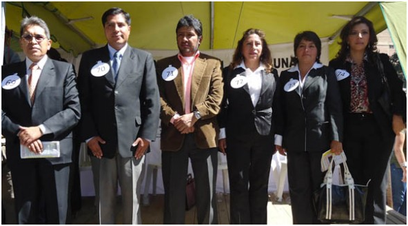 Los postulantes ubicados en la tarima, llevaban en el lado izquierdo del pecho el número que se les asignó de acuerdo a sorteo y con el que figuran en la papeleta. Se dio a cada candidato dos minutos para dar su nombre y mencionar su formación y trayectoria profesional, la mayoría lo hizo en dos idiomas, en quechua y español.