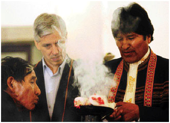 Anoche, los amautas de Charazani se presentaron en palacio y procedieron a ‘milluchar’ (alejar los malos espíritus) al presidente y ahuyentar la mala suerte del Gobierno.