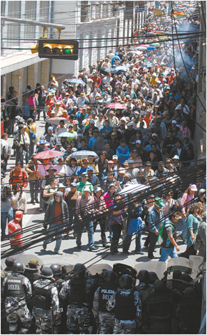La Paz. Cientos de manifestantes avanzan sobre la calle Ingavi rumbo a la plaza Murillo, donde un grupo de policias impidió su acceso.