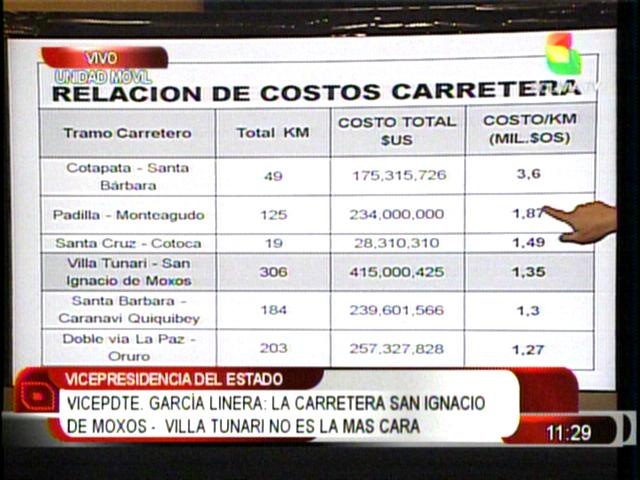 “No es la carretera más cara, hay carreteras mucho más caras por la topografía y otras características, y estamos hablando de una carretera construida en zona de bosque y selvática, alejada de los centros de aprovisionamiento, sin presencia cercana de los materiales de construcción que se requiere”, explicó García Linera.