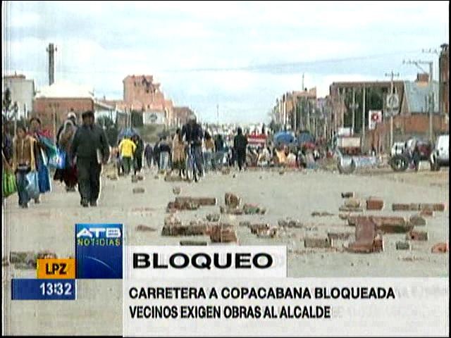 El Alto.- Bloqueada, ese es el panorama que presenta la carretera hacia Copacabana a la altura del barrio Bautista Saavedra, del Distrito 4 y 5 de la ciudad de El Alto, vecinos bloquean esta carretera denunciando que no hay obras de parte de la Alcaldía.