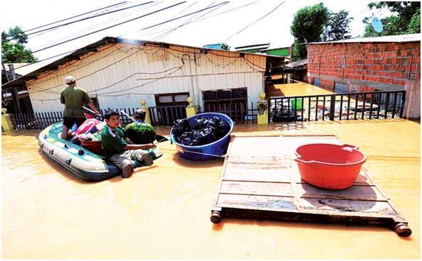 Las aguas están a tres metros de alcanzar el punto más alto del puente internacional que une Cobija con la vecina Brasilea. La ciudad brasileña está en la parte inferior de esta zona, por lo que el 80% del área poblada está bajo o en medio de las aguas del Acre, manifestó García.