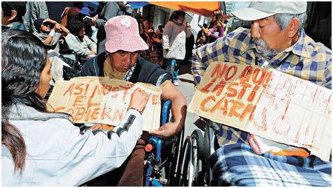 Medida. Las personas discapacitadas escriben leyendas con su propia sangre en pancartas. Foto: Miguel Carrasco