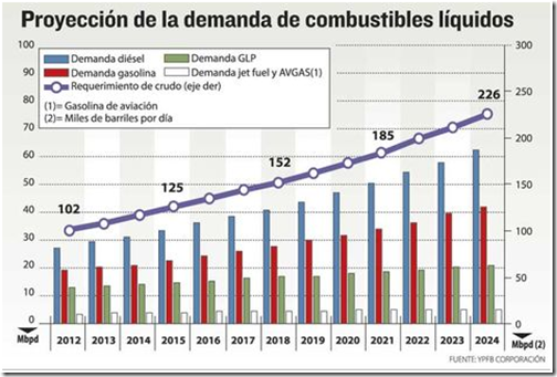 Los datos señalan que el impacto económico del subsidio al carburante ocasionarían al país un gasto de “$us 1.340 millones” hasta 2015 y de “$us 10.372 millones” hasta 2026. En el corto plazo, la demanda promedio de crudo de Bolivia se incrementará de 102 mil barriles por día (Bbld) en este año a 125 mil Bbld en 2015. En 2026, el requerimiento llegará a 258 mil Bbld.
