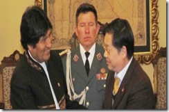 Ref. fotografía La Prensa 23.12.11 El presidente Morales estrecha la mano del Embajador de China luego de suscribir el acuerdo de crédito por $us.100 millones para la compra de 6 helicópteros.
