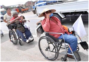 Es la caravana de 125 personas en sillas de ruedas, asistidos por algún muchacho, una persona mayor o lazarillos ocasionales que se conmueven ante la escena. La larga travesía se inició el 15 de noviembre del año pasado en Trinidad y parecía que su protesta había perforado el sentimiento de las autoridades de Gobierno hace una semana, pero el pedido de 3.000 bolivianos anuales para los incapacitados graves recibió como contrapropuesta el monto de 1.000 bolivianos que no fue aceptada, de manera que la marcha estacionada temporalmente en Quillacollo reanudó su fatigosa empresa.