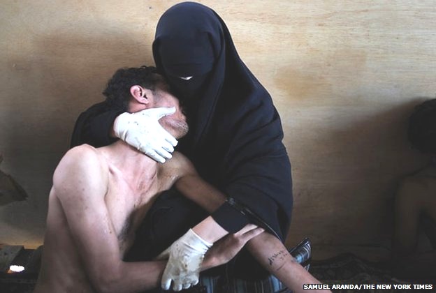 Su nombre es Fatima al Qaws y aparece en la fotografía con su hijo, Zayed, quien había sido herido mientras participaba en una protesta antigubernamental en Sanaa, la capital de Yemen.