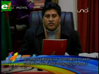 El Gobernador del departamento de La Paz, Cesar Cocarico, declaró este miércoles emergencia departamental tras cuatro días de intensas lluvias que afectaron a unas 3.000 familias, 17 municipios y 12.000 hectáreas afectadas por las inundaciones. Explicó en conferencia de prensa que se gastó 3.5 millones de bolivianos para ayudar a los damnificados, sin embargo dijo que estos recursos son insuficientes y se requiere de un monto más elevado para sobrellevar los efectos del fenómeno de La Niña. “17 municipios han sido declarados en emergencia, 12.000 hectáreas de sembradíos fueron afectados, éstos requieren de nuestro concurso por lo que como primera medida hemos decidido declarar en emergencia al departamento de La Paz con el objetivo de auxiliar a las comunidades", agregó.