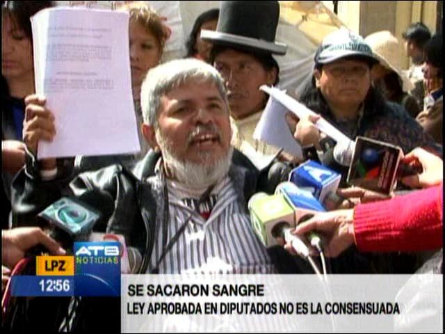 “10 artículos no existen acá y los cambios son latentes. En primer lugar queremos una inserción laboral obligatoria que ya la tenemos conquistada desde el gobierno de Carlos Mesa a través del decreto 27467, esta ley lo cercena y deja al libre albedrio a las instituciones si quieren contratan, si no quieren no contratan”, indicó el dirigente Jaime Estivariz. (ATB)