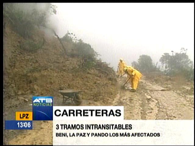 Las vías están intransitables por las intensas lluvias, los departamentos más afectados son La Paz, Beni y Pando, éste último tras la crecida del río Tahuamanu se cortó la vía entre Cobija y Porvenir.