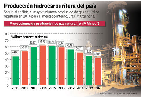 Según el Análisis Estadístico, Regalías y Participaciones Hidrocarburíferas Período 2000-2010, del Ministerio de Hidrocarburos, tras alcanzar su máximo rendimiento en 2014, la producción de gas natural del país entrará en declinación desde 2015 (ver infografía).