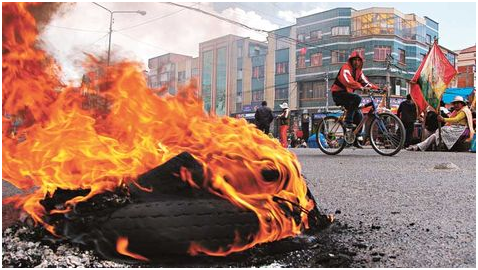 Bloqueo. Una pira con llantas sobre la avenida 6 de Marzo. Al fondo, un grupo de vecinos con sus estandartes cierran la arteria principal de El Alto.
