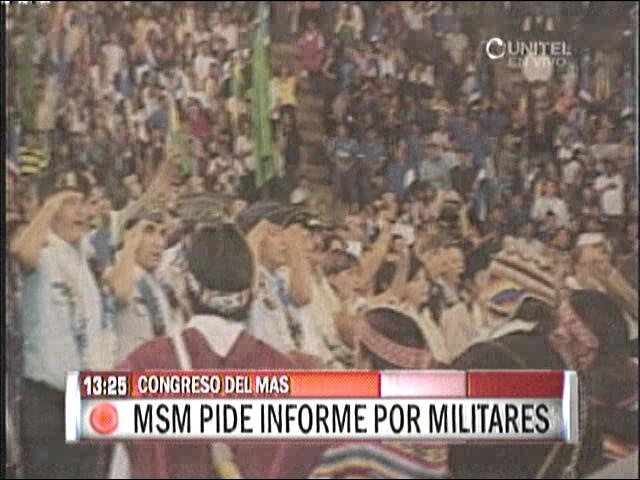 “Cuatro jefes militares de uniforme, vale decir en representación de la institución castrense en el congreso del MAS violando precisamente el artículo 245 de la Constitución, esta disposición constitucional dice que como organismo institucional no realiza acción política alguna, (pero) aquí están en representación institucional estos cuatro jefes militares. Nuestros parlamentarios están presentando una petición de informe para, en primer lugar, identificar de quiénes se trata, sus mandos, sus responsabilidades y el por qué de su presencia en un acto no institucional gubernamental sino en un acto absolutamente político partidario. Por supuesto acá estamos ante una reiteración grosera de lo que el MSM ha denunciado, se está utilizando, partidizando, manipulando y subordinando a los mandos militares que son del país, no son del gobierno, a los dictados de un partido político”. (Fides)