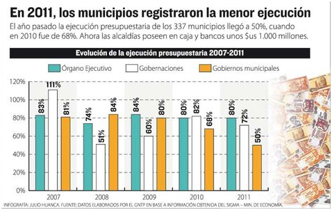 Recursos. “Son cerca a $us 1.700 millones entre gobernaciones y municipios. De ahí, 1.000 millones corresponden a municipios y deben ser entre 400 y 450 millones de la gestión 2011”, afirmó entonces Arce. El presidente Morales insistió en que los alcaldes tienen como tarea la ejecución de todo el presupuesto que se asigna a sus municipios.