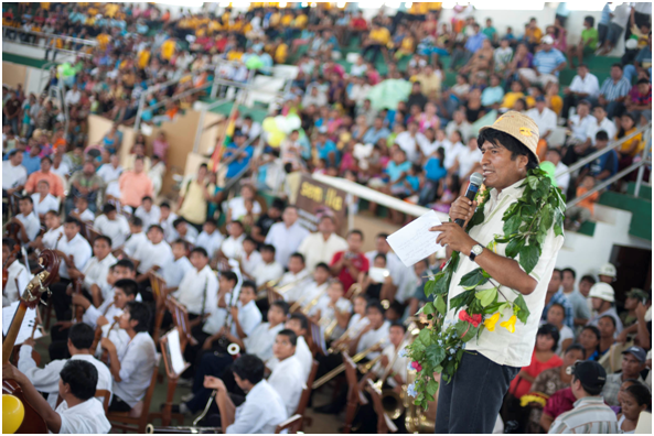 image Viernes 20 de abril de 2012. El Presidente Evo morales hace entrega de obras en la población de Urubichá, provincia Guarayos del Departamento de Santa Cruz. Foto ABI.