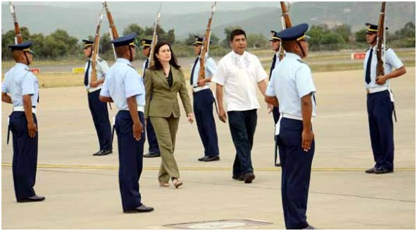 La jefe de Gabinete de la OEA, Carmen Lucía de la Pava, fue la encargada de probar las graderías de descenso del avión, simulando ser una canciller, y realizar todo el protocolo de llegada.
