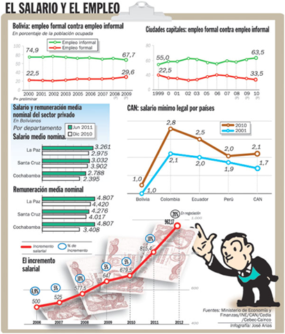 Bolivia tiene el salario mínimo nacional (SMN) (menos de $us 120) más bajo de los países de la región andina, de acuerdo con una comparación reciente elaborada por la Comunidad Andina de Naciones (CAN), según un informe del Centro de Estudios para el De- sarrollo Laboral y Agrario (Cedla). No obstante, Bolivia resulta ser el más ‘barato’ de Sudamérica, lo que es admitido por el Gobierno y los empresarios.