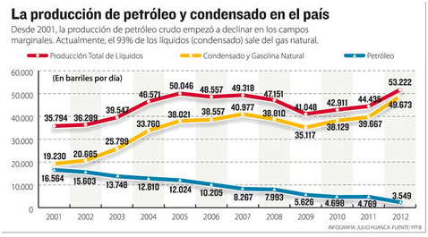 La producción de petróleo crudo caerá este año en 26% debido principalmente a la declinación en los campos petroleros operados por YPFB Chaco, Repsol y Petrobras, entre otras. El año pasado, la producción de petróleo crudo era de 4.769 barriles día (Bbld). Para esta gestión se calcula en 3.549 Bbld ese volumen.