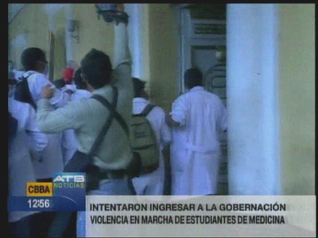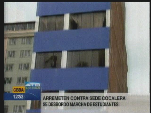 Los estudiantes de la Facultad de Medicina de San Simón apedrearon la sede departamental del MAS en Cochabamba, en el edificio también funciona la sede de las Seis Federaciones de Cocaleros del Trópico, están molestos por la gasificación a estudiantes en La Paz.